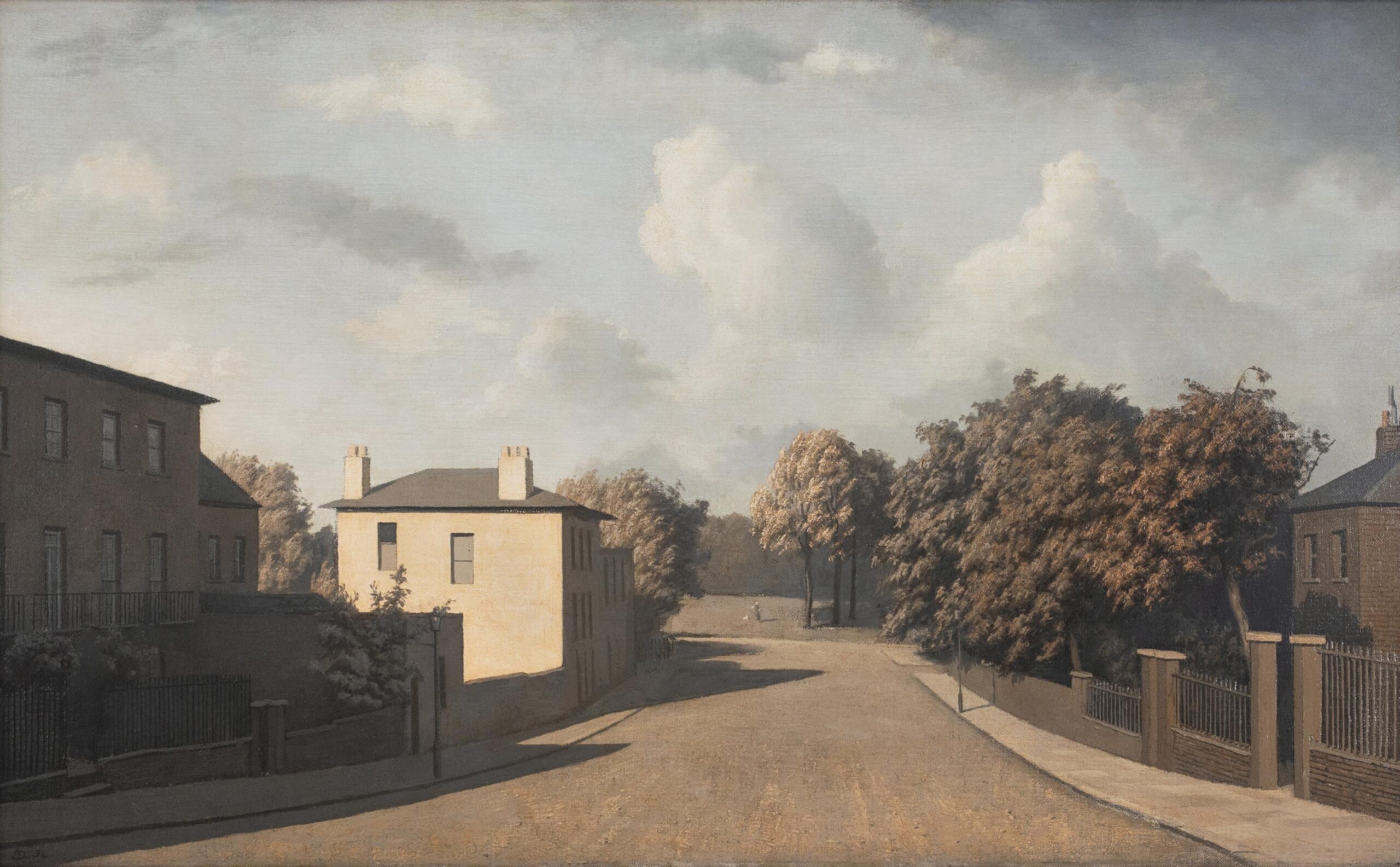 The work depicts the north-eastern end of Downshire Hill as it runs down to Hampstead Heath, featuring the former Freemasons Arms and the entrance to the heath beyond. Newton’s composition is characteristically foreshortened, bringing the edge of the heath closer to the viewer than it appears in reality. This artistic choice allows him to express a more expansive scene—a typical Newton approach where atmosphere and architecture take precedence over human activity.